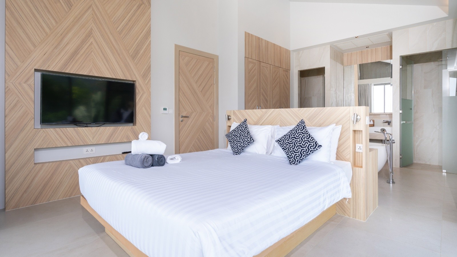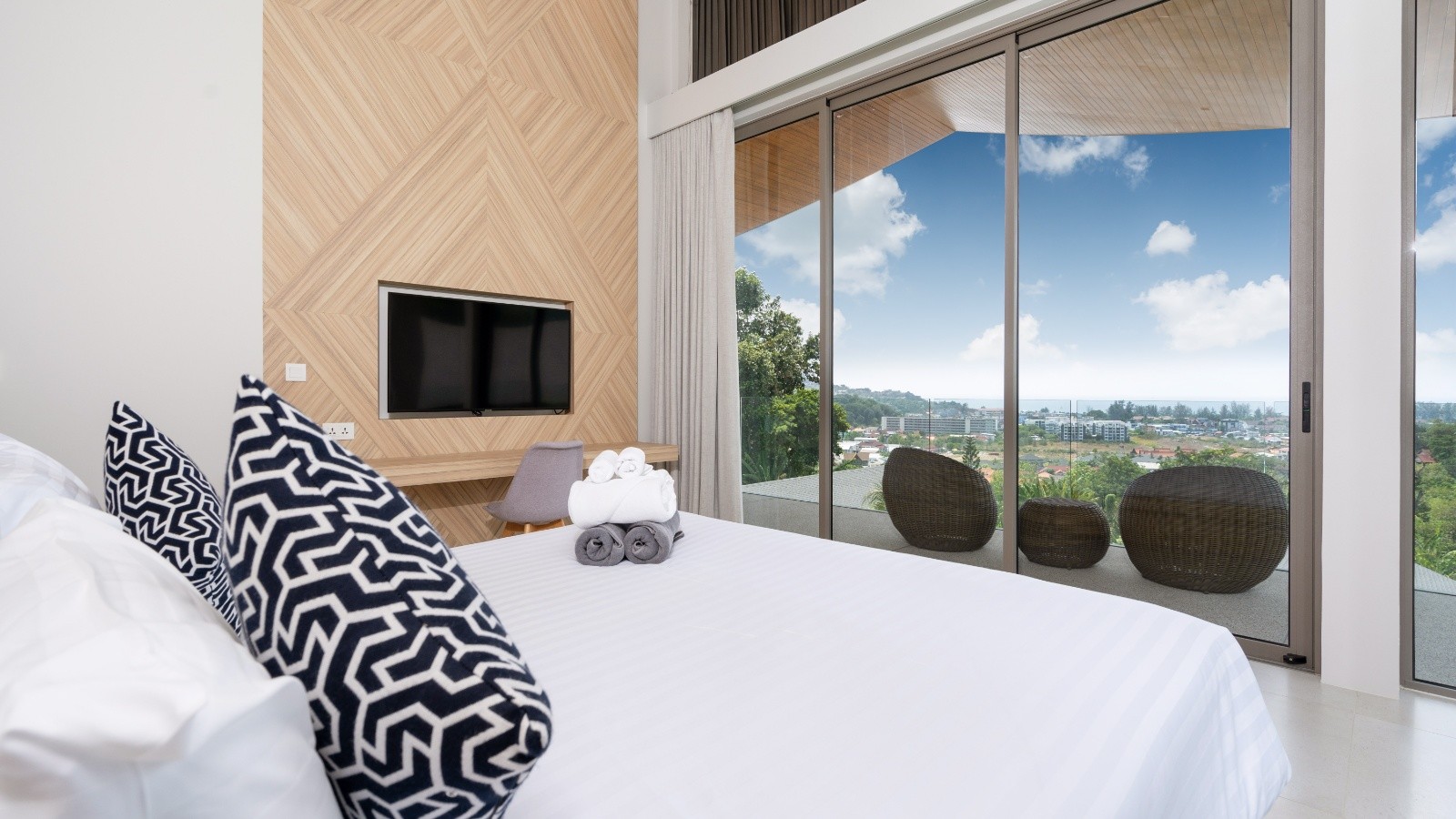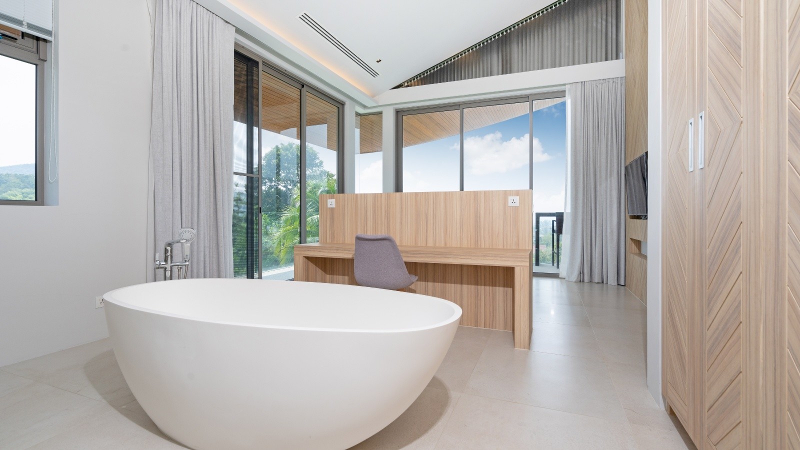 這棟別墅的每間臥室都直接通往陽台,陽台配有戶外家具,並可欣賞美麗的綠意景觀。寬敞的臥室還配備電視、套房浴室(可選擇浴缸或淋浴間,甚至兩者兼備)、辦公區及豐富的儲藏設施。賓客將享受美麗的山脈、游泳池,以及從臥室望出的四周景觀,因為每間臥室至少有一面牆是玻璃製成。浴室有吹風機、雙層洗手台、沐浴露、衛生紙、毛巾和馬桶。