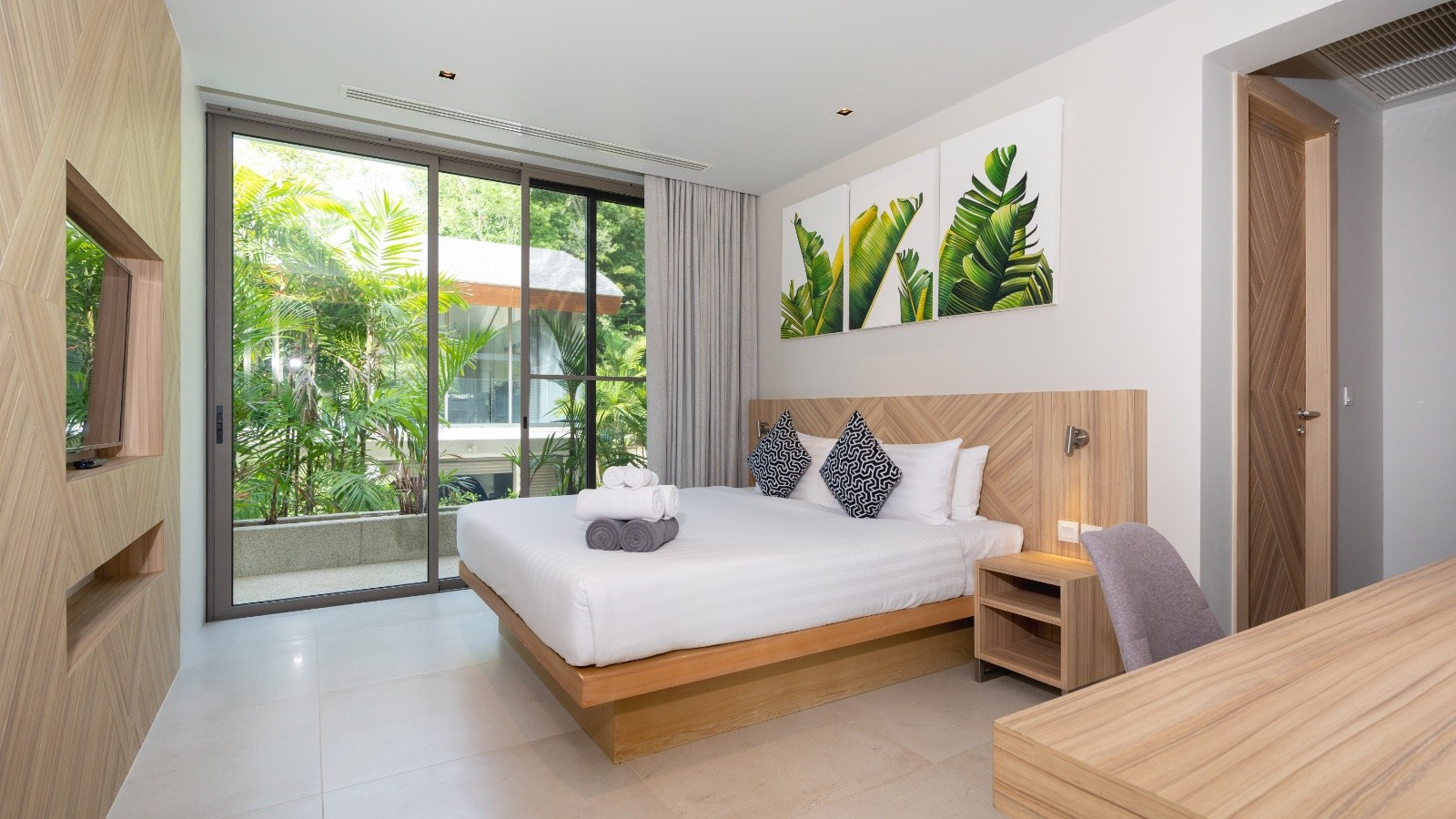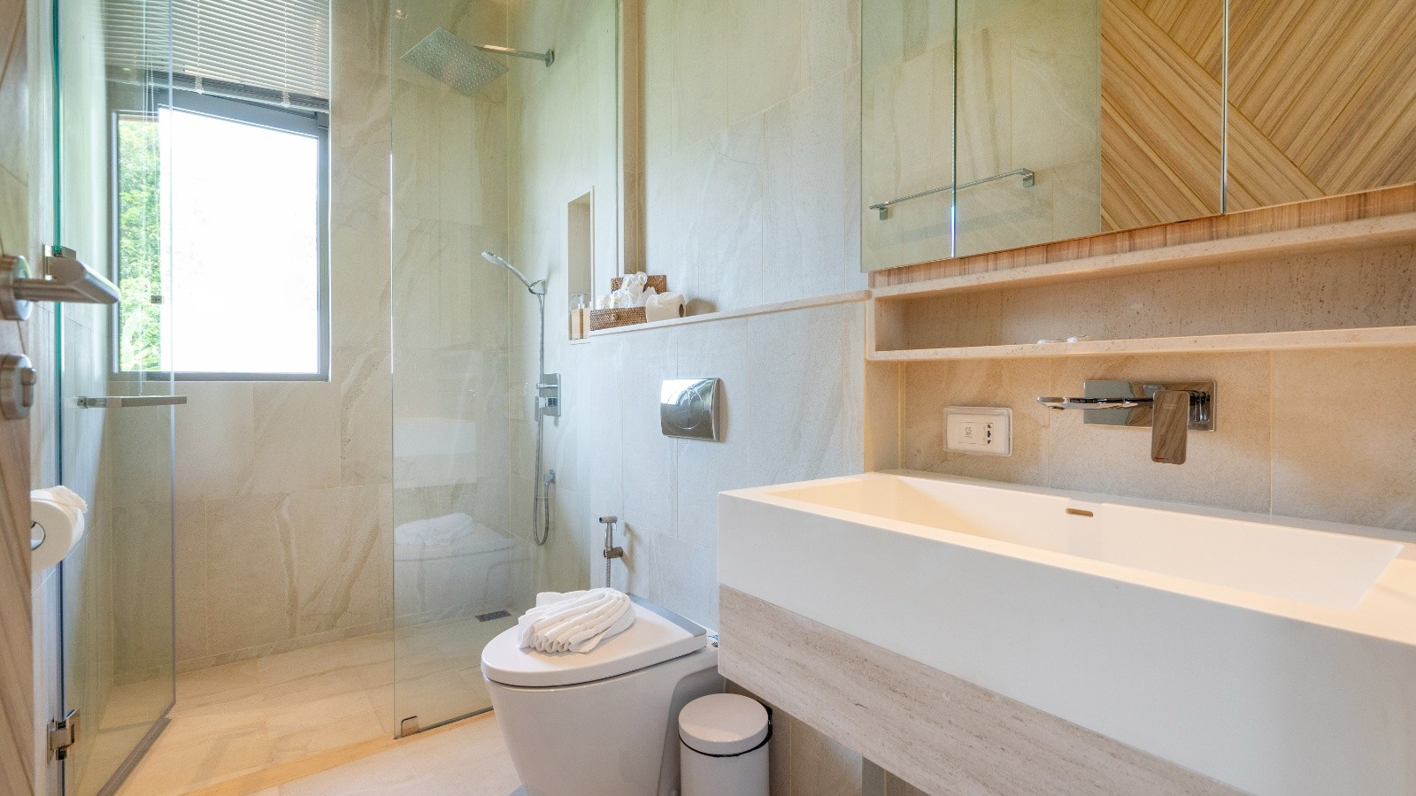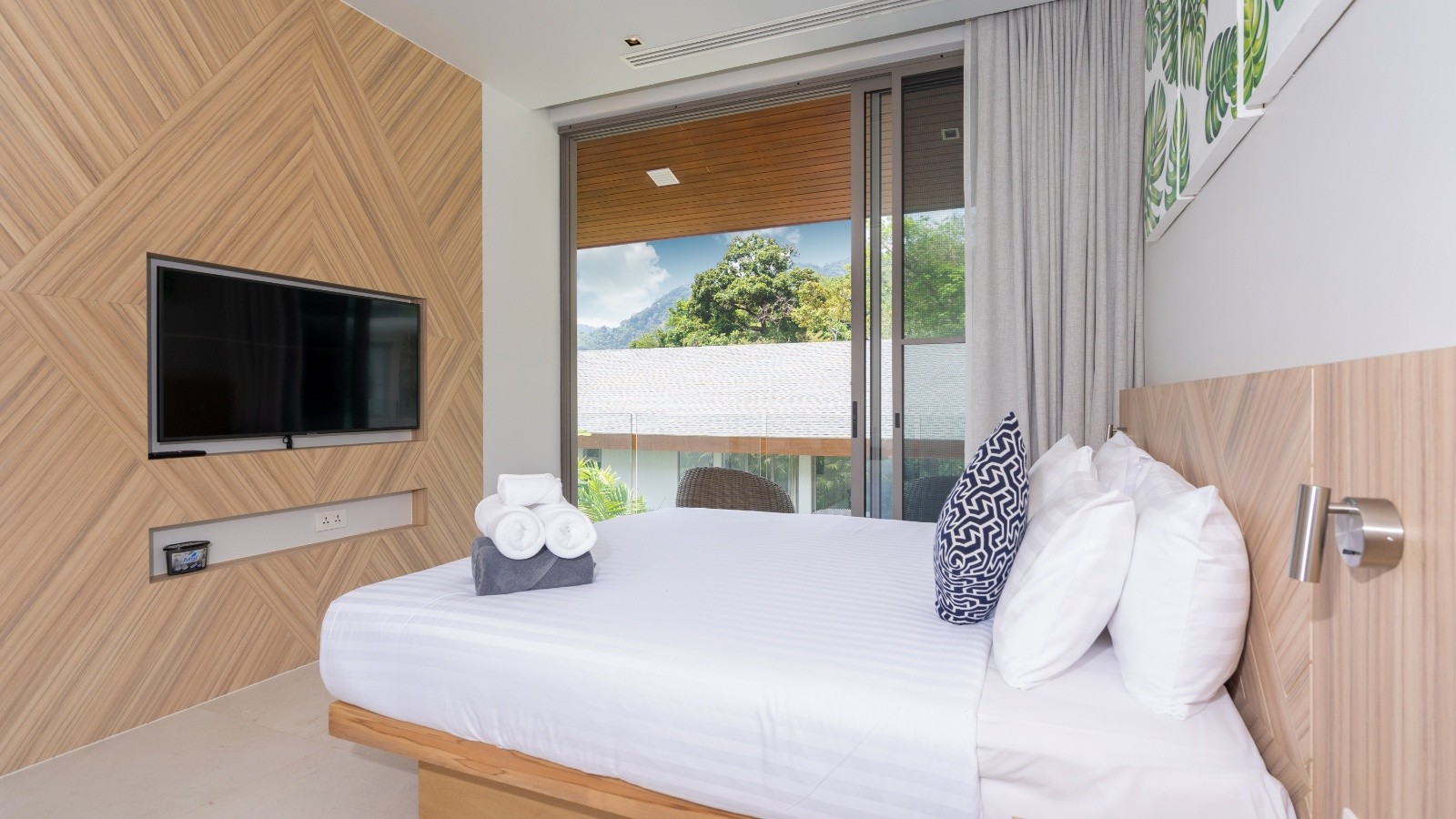 這棟別墅的每間臥室都直接通往陽台,陽台配有戶外家具,並可欣賞美麗的綠意景觀。寬敞的臥室還配備電視、套房浴室(可選擇浴缸或淋浴間,甚至兩者兼備)、辦公區及豐富的儲藏設施。賓客將享受美麗的山脈、游泳池,以及從臥室望出的四周景觀,因為每間臥室至少有一面牆是玻璃製成。浴室有吹風機、雙層洗手台、沐浴露、衛生紙、毛巾和馬桶。