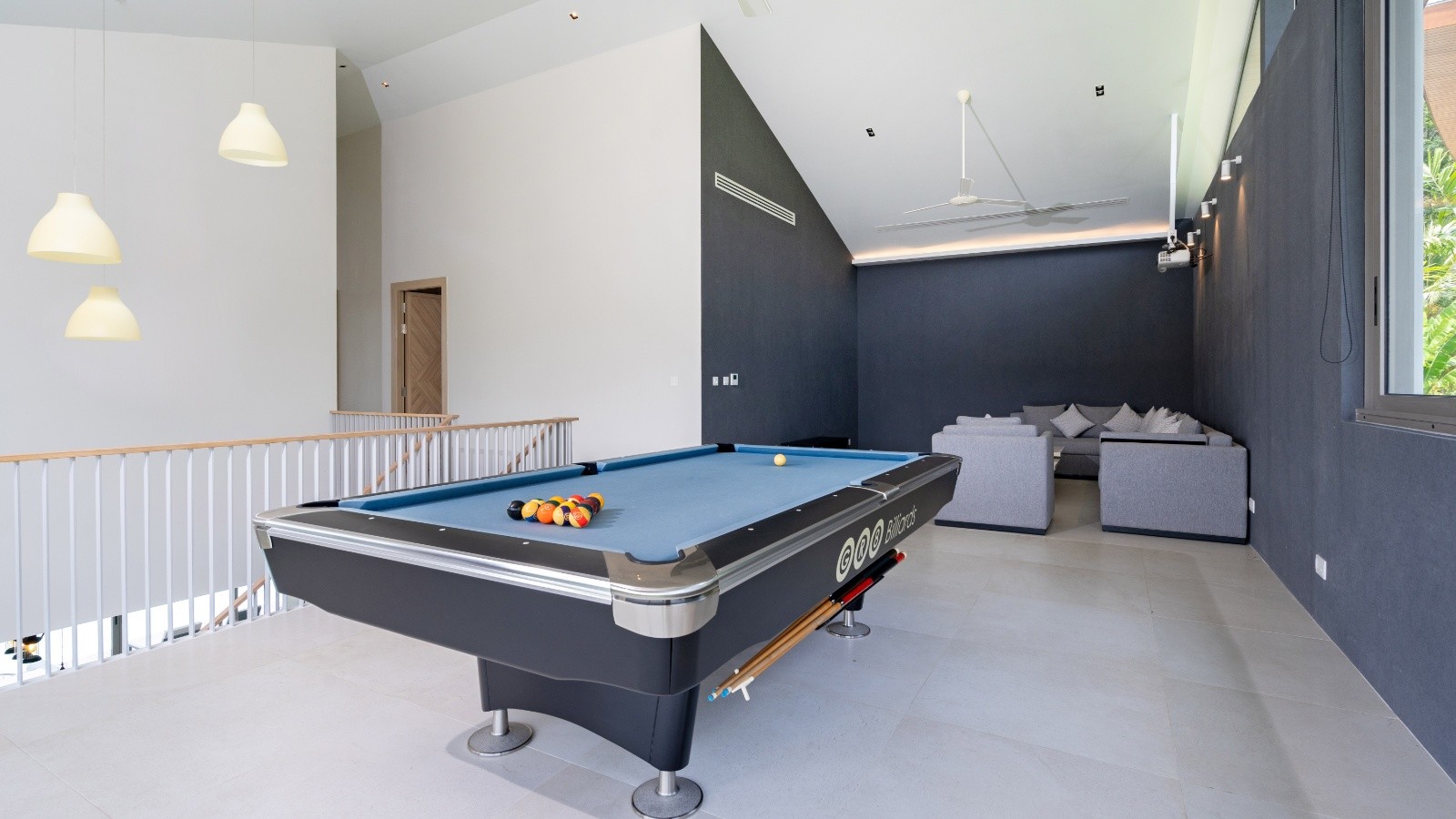 此物業的內部設計兼具奢華與舒適。一間通風明亮的客廳,配有一張長長的L形灰色沙發,沙發後方掛著牆壁,歡迎你來到這間出租屋的室內空間。同一塊地上,你還能找到一個配備高品質餐具的用餐區,能容納所有賓客。廚房和廚房吧台也在同一個房間裡。整個公共區域可直接通往游泳池露臺。對於喜歡隱私的人來說,別墅還有第二個室內休息區,配有桌球,適合遊戲愛好者使用。