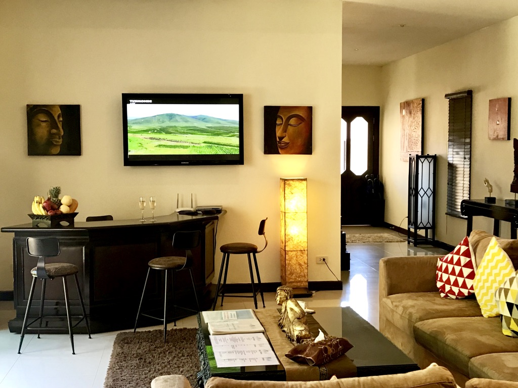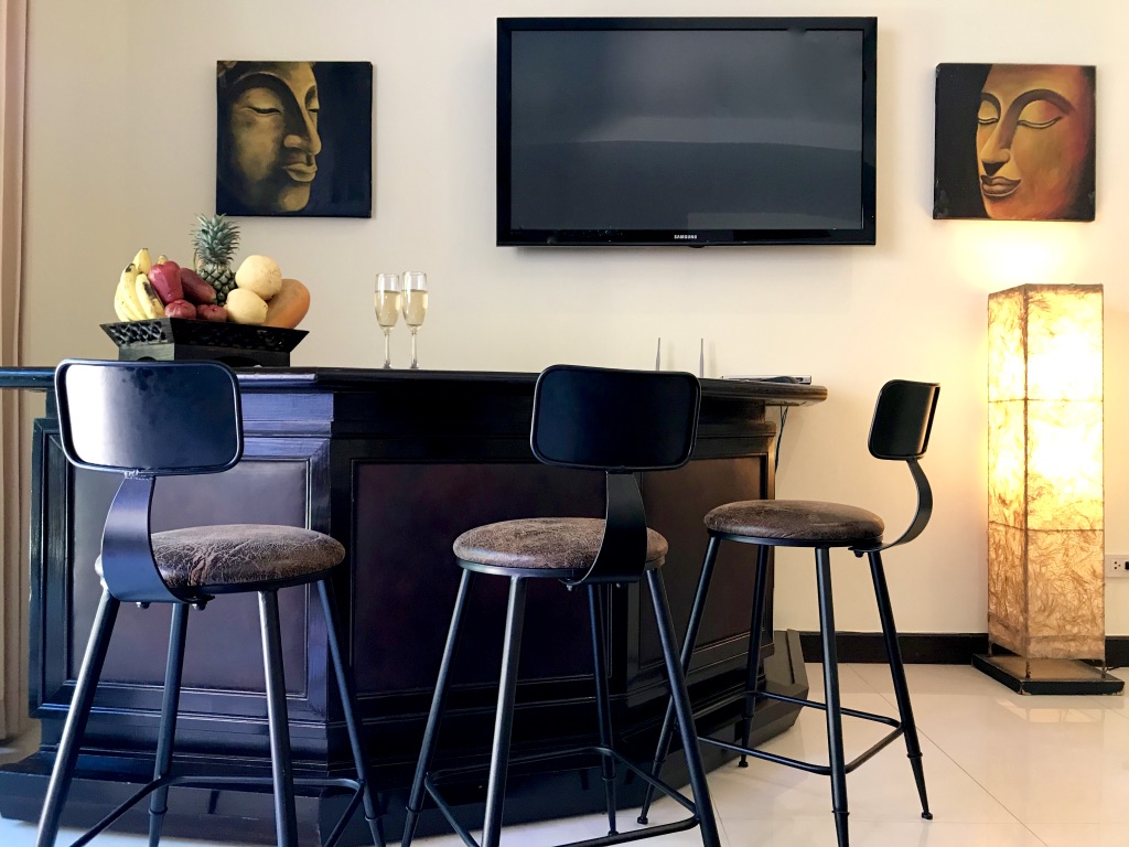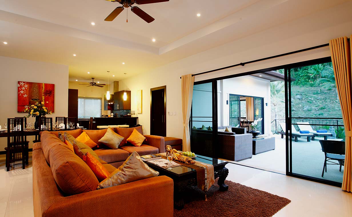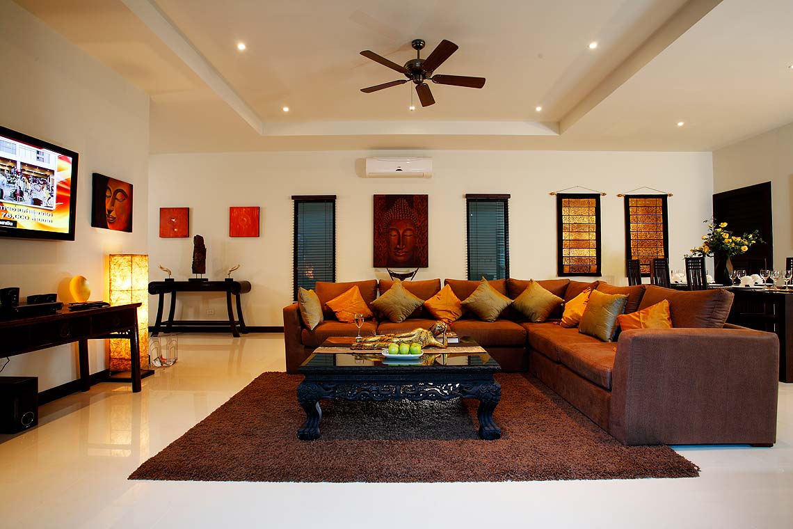 滑動門打開通往客廳,寬敞又寬敞。牆面粉刷白,地板鋪設大理石,點綴中國文物與泰國藝術品,舒適的沙發提供休息選擇,並可欣賞泳池邊的景觀。這裡有大型平面電視、有線電視,還有一個小型電影庫供你挑選。無線網路確保你在需要時能與朋友和同事溝通。客廳有假天花板,燈光溫暖且令人舒緩。客廳左側有一個小巧的木製吧台,非常適合喝一兩杯。餐廳設有一張可舒適容納8人的餐桌。下一個房間是開放式且設備齊全的廚房,你可以在這裡烹飪你喜愛的料理,或請主廚製作幾道傳統泰式料理。主廚可應要求提供服務,且不包含在整體費用內。