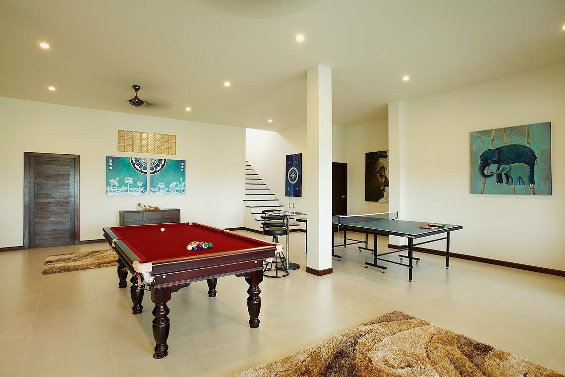 別墅內設有豪華的戶外用餐區,確保賓客享有典範的堂食體驗。同時也維持一個設備齊全的模組化廚房,準備各式美食。寬敞的客廳與細膩的室內設計,確保賓客享有極致的休閒時光。此外,電影迷也設有專屬影音室,確保住宿愉快。你可以在桌遊室玩乒乓球、桌球和飛鏢玩得很開心。