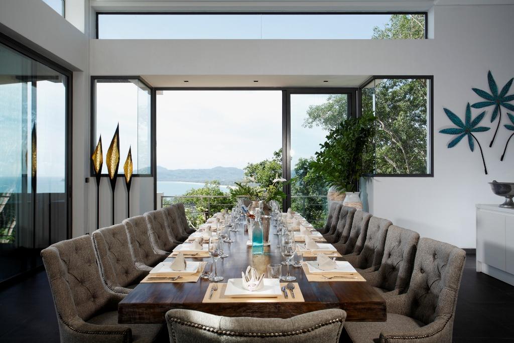 客廳設有豪華座椅和大型平面電視,非常適合與親友放鬆。用餐區緊鄰,提供充足的座位和現代化的餐桌,能容納大型聚會。客廳與餐廳區皆直接面向泳池區,提供壯麗景觀並輕鬆使用戶外設施。